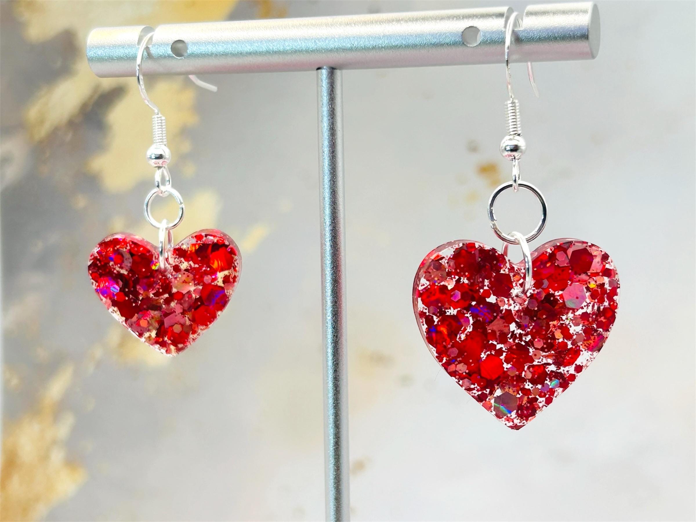 Handmade Red Glitter Heart Earrings: Sterling Silver Hooks, Resin Charm