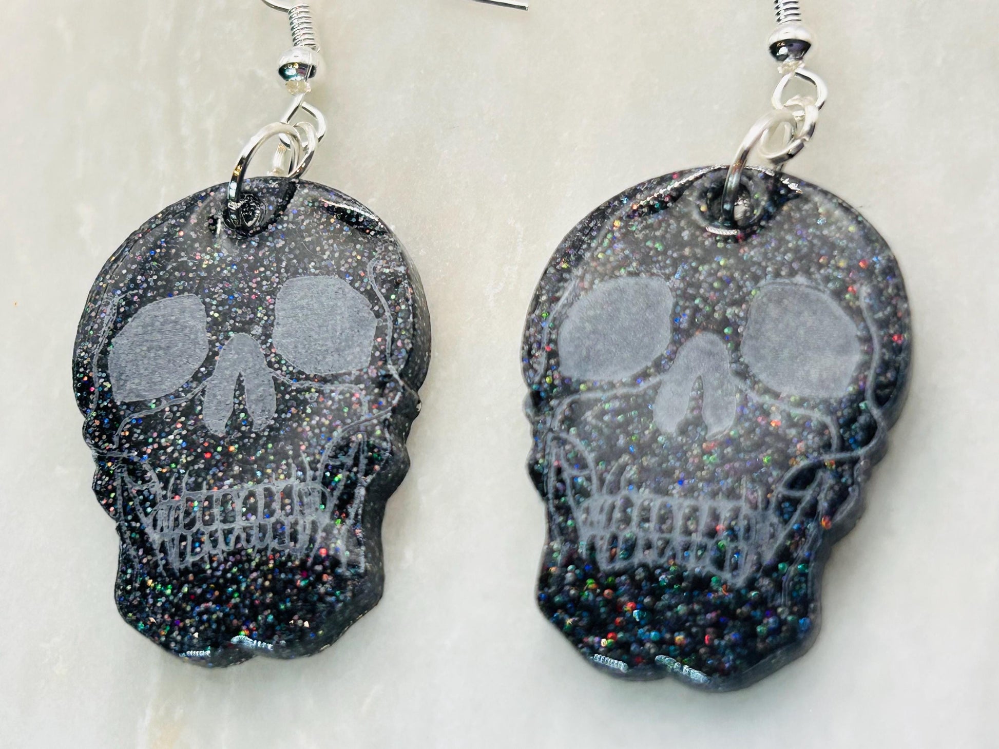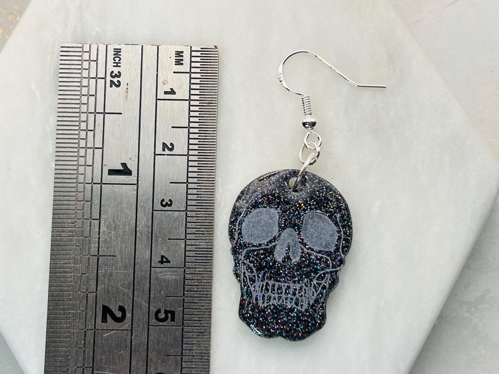 Handmade Halloween Skull Earrings: Resin with Black Holographic Giltter, Stirling Silver Hooks
