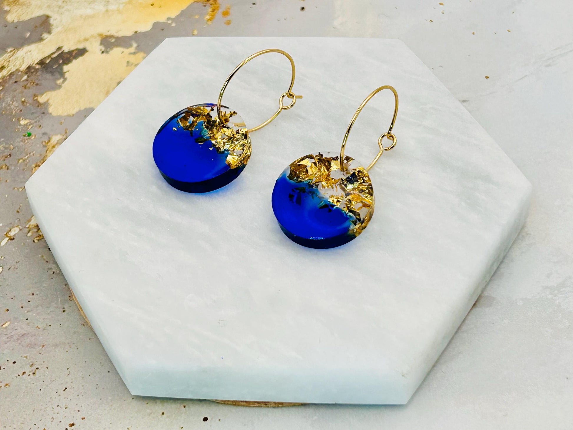 Handmade Royal Blue Resin Earrings: Gold Leaf, Gold Plated Hoops