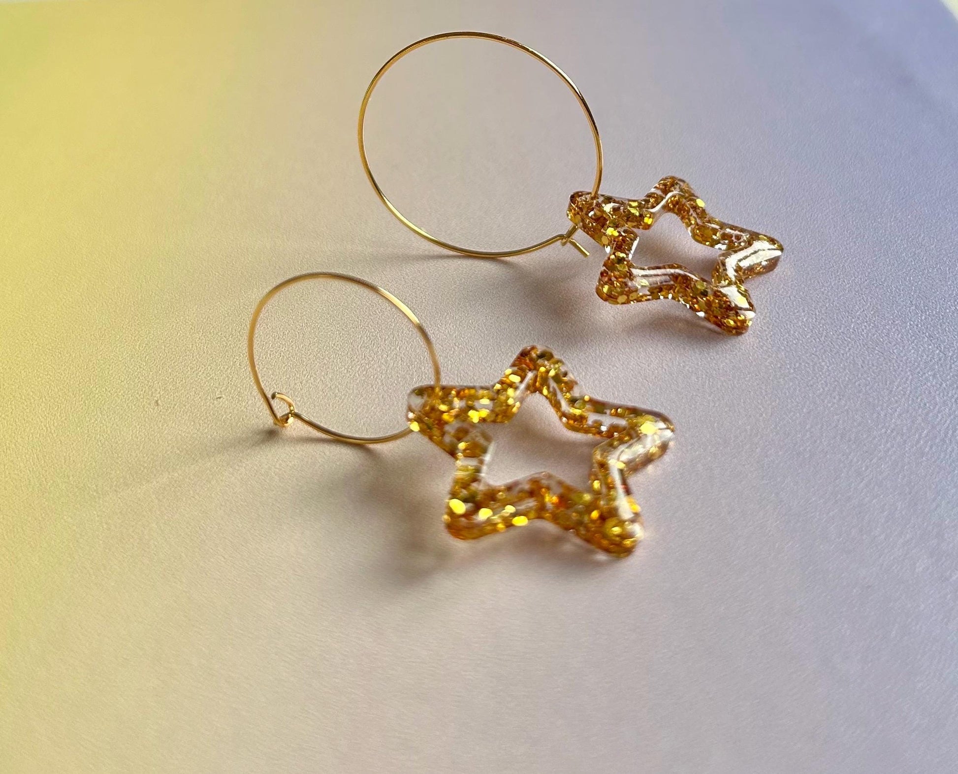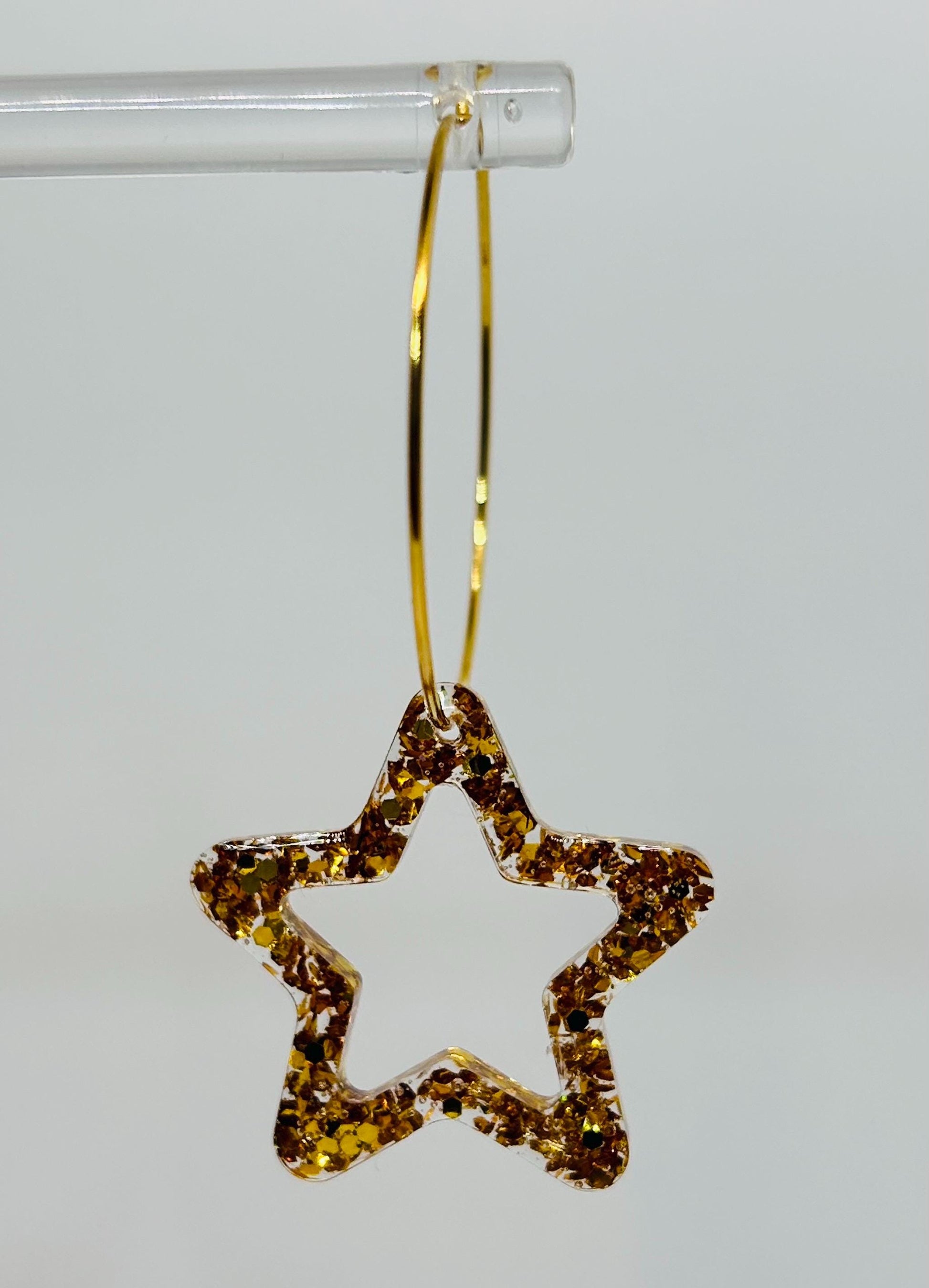 Handmade Star Gold Glitter Resin Earrings, gold plated hoops, choose different hoop sizes